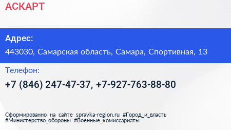 АСКАРТ по адресу 443030, Самарская область, Самара, Спортивная, 13 в дальнейшем Организация, размещена в следующих категориях: