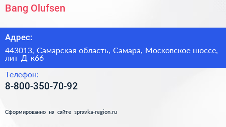 Bang & Olufsen по адресу 443013, Самарская область, Самара, Московское шоссе, лит Д к66 в дальнейшем Организация, размещена в следующих категориях: