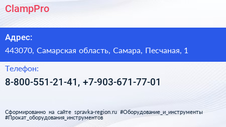 ClampPro по адресу 443070, Самарская область, Самара, Песчаная, 1 в дальнейшем Организация, размещена в следующих категориях: