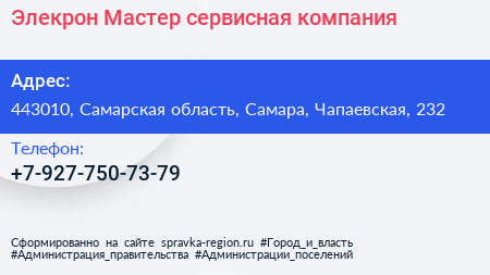 Элекрон-Мастер, сервисная компания по адресу 443010, Самарская область, Самара, Чапаевская, 232 в дальнейшем Организация, размещена в следующих категориях:
