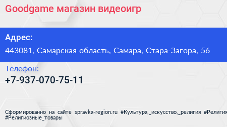 Goodgame, магазин видеоигр по адресу 443081, Самарская область, Самара, Стара-Загора, 56 в дальнейшем Организация, размещена в следующих категориях:
