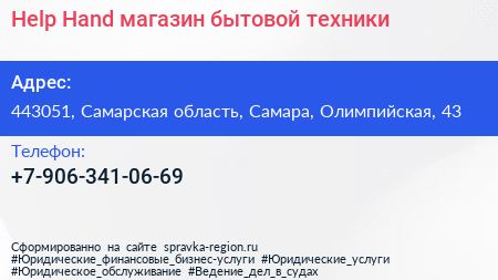 Help & Hand, магазин бытовой техники по адресу 443051, Самарская область, Самара, Олимпийская, 43 в дальнейшем Организация, размещена в следующих категориях: