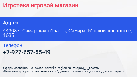 Игротека, игровой магазин по адресу 443087, Самарская область, Самара, Московское шоссе, 163Б в дальнейшем Организация, размещена в следующих категориях: