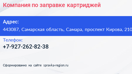 Компания по заправке картриджей по адресу 443087, Самарская область, Самара, проспект Кирова, 210 в дальнейшем Организация, размещена в следующих категориях: