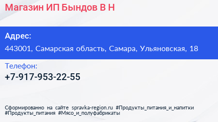 Магазин, ИП Бындов В.Н. по адресу 443001, Самарская область, Самара, Ульяновская, 18 в дальнейшем Организация, размещена в следующих категориях: