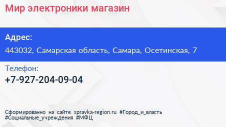 Мир электроники, магазин по адресу 443032, Самарская область, Самара, Осетинская, 7 в дальнейшем Организация, размещена в следующих категориях: