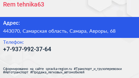 Rem-tehnika63 по адресу 443070, Самарская область, Самара, Авроры, 68 в дальнейшем Организация, размещена в следующих категориях: