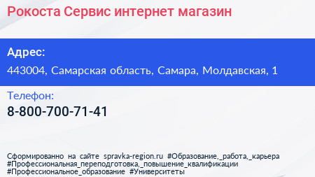 Рокоста-Сервис, интернет-магазин по адресу 443004, Самарская область, Самара, Молдавская, 1 в дальнейшем Организация, размещена в следующих категориях: