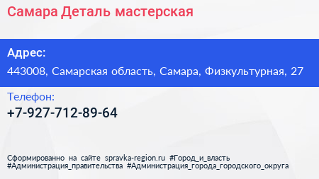 Самара Деталь, мастерская по адресу 443008, Самарская область, Самара, Физкультурная, 27 в дальнейшем Организация, размещена в следующих категориях:
