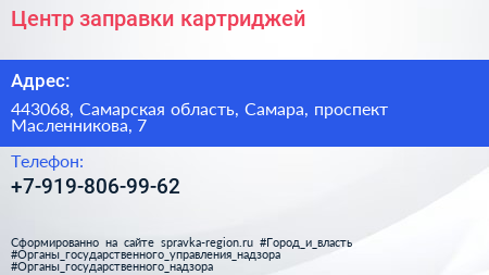 Центр заправки картриджей по адресу 443068, Самарская область, Самара, проспект Масленникова, 7 в дальнейшем Организация, размещена в следующих категориях: