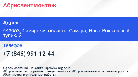 Абрисвентмонтаж по адресу 443063, Самарская область, Самара, Ново-Вокзальный тупик, 21 в дальнейшем Организация, размещена в следующих категориях: