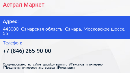 Астрал.Маркет по адресу 443080, Самарская область, Самара, Московское шоссе, 55 в дальнейшем Организация, размещена в следующих категориях: