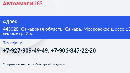 Автоэмали163 по адресу 443028, Самарская область, Самара, Московское шоссе 18 километр, 25с в дальнейшем Организация, размещена в следующих категориях: