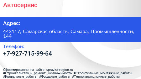 Автосервис по адресу 443117, Самарская область, Самара, Промышленности, 144 в дальнейшем Организация, размещена в следующих категориях: