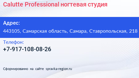 Calutte Professional, ногтевая студия по адресу 443105, Самарская область, Самара, Ставропольская, 218 в дальнейшем Организация, размещена в следующих категориях: