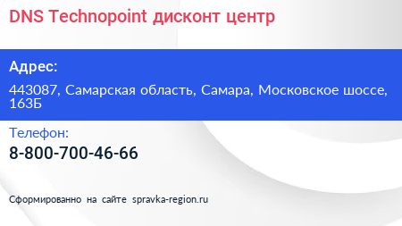 DNS Technopoint, дисконт-центр по адресу 443087, Самарская область, Самара, Московское шоссе, 163Б в дальнейшем Организация, размещена в следующих категориях: