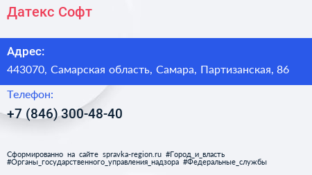 Датекс Софт по адресу 443070, Самарская область, Самара, Партизанская, 86 в дальнейшем Организация, размещена в следующих категориях: