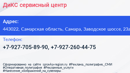 ДиКС, сервисный центр по адресу 443022, Самарская область, Самара, Заводское шоссе, 23а в дальнейшем Организация, размещена в следующих категориях: