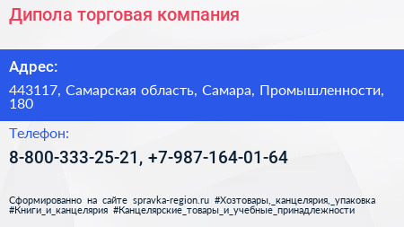 Дипола, торговая компания по адресу 443117, Самарская область, Самара, Промышленности, 180 в дальнейшем Организация, размещена в следующих категориях: