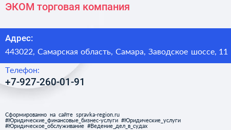 ЭКОМ, торговая компания по адресу 443022, Самарская область, Самара, Заводское шоссе, 11 в дальнейшем Организация, размещена в следующих категориях: