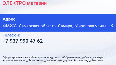 ЭЛЕКТРО, магазин по адресу 446208, Самарская область, Самара, Миронова улица, 19 в дальнейшем Организация, размещена в следующих категориях: