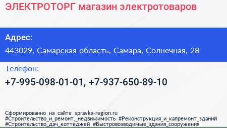 ЭЛЕКТРОТОРГ, магазин электротоваров по адресу 443029, Самарская область, Самара, Солнечная, 28 в дальнейшем Организация, размещена в следующих категориях:
