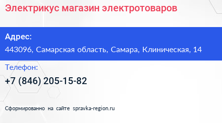 Электрикус, магазин электротоваров по адресу 443096, Самарская область, Самара, Клиническая, 14 в дальнейшем Организация, размещена в следующих категориях: