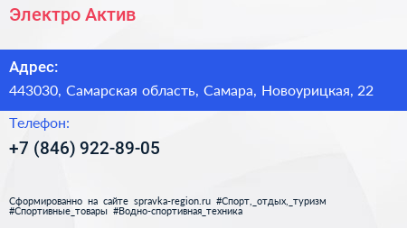 Электро-Актив по адресу 443030, Самарская область, Самара, Новоурицкая, 22 в дальнейшем Организация, размещена в следующих категориях: