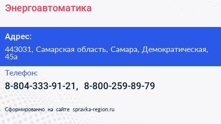 Энергоавтоматика по адресу 443031, Самарская область, Самара, Демократическая, 45а в дальнейшем Организация, размещена в следующих категориях: