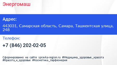 Энергомаш по адресу 443031, Самарская область, Самара, Ташкентская улица, 248 в дальнейшем Организация, размещена в следующих категориях: