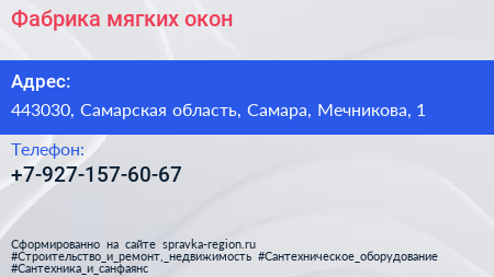 Фабрика мягких окон по адресу 443030, Самарская область, Самара, Мечникова, 1 в дальнейшем Организация, размещена в следующих категориях: