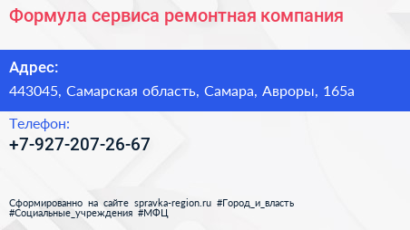 Формула сервиса, ремонтная компания по адресу 443045, Самарская область, Самара, Авроры, 165а в дальнейшем Организация, размещена в следующих категориях: