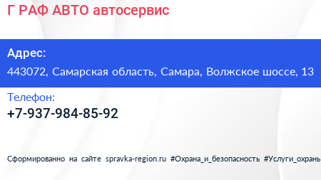 Г.РАФ АВТО, автосервис по адресу 443072, Самарская область, Самара, Волжское шоссе, 13 в дальнейшем Организация, размещена в следующих категориях: