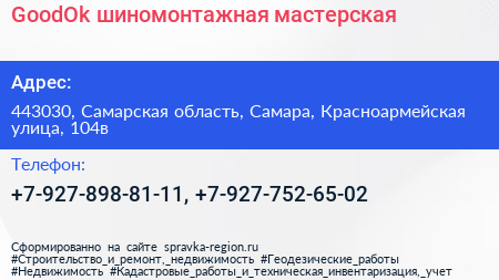 GoodOk, шиномонтажная мастерская по адресу 443030, Самарская область, Самара, Красноармейская улица, 104в в дальнейшем Организация, размещена в следующих категориях: