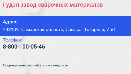 Гудэл, завод сварочных материалов по адресу 443109, Самарская область, Самара, Товарная, 7 к1 в дальнейшем Организация, размещена в следующих категориях: