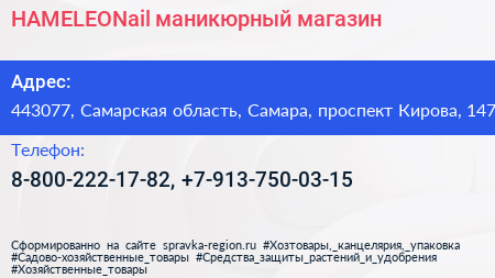 HAMELEONail, маникюрный магазин по адресу 443077, Самарская область, Самара, проспект Кирова, 147 в дальнейшем Организация, размещена в следующих категориях: