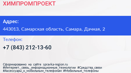 ХИМПРОМПРОЕКТ по адресу 443013, Самарская область, Самара, Дачная, 2 в дальнейшем Организация, размещена в следующих категориях: