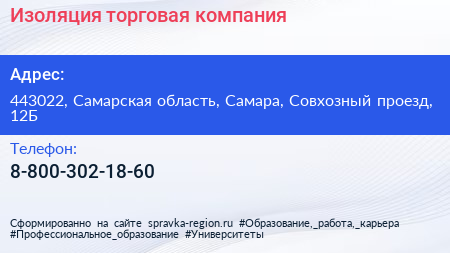 Изоляция, торговая компания по адресу 443022, Самарская область, Самара, Совхозный проезд, 12Б в дальнейшем Организация, размещена в следующих категориях:
