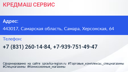КРЕДМАШ-СЕРВИС по адресу 443017, Самарская область, Самара, Херсонская, 64 в дальнейшем Организация, размещена в следующих категориях: