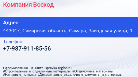 Компания Восход по адресу 443047, Самарская область, Самара, Заводская улица, 1 в дальнейшем Организация, размещена в следующих категориях: