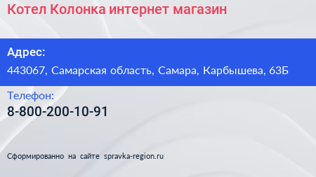 Котел & Колонка, интернет-магазин по адресу 443067, Самарская область, Самара, Карбышева, 63Б в дальнейшем Организация, размещена в следующих категориях: