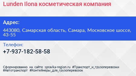 Lunden Ilona, косметическая компания по адресу 443080, Самарская область, Самара, Московское шоссе, 43-55 в дальнейшем Организация, размещена в следующих категориях: