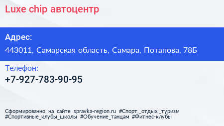 Luxe-chip, автоцентр по адресу 443011, Самарская область, Самара, Потапова, 78Б в дальнейшем Организация, размещена в следующих категориях: