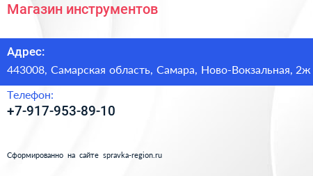 Магазин инструментов по адресу 443008, Самарская область, Самара, Ново-Вокзальная, 2ж в дальнейшем Организация, размещена в следующих категориях: