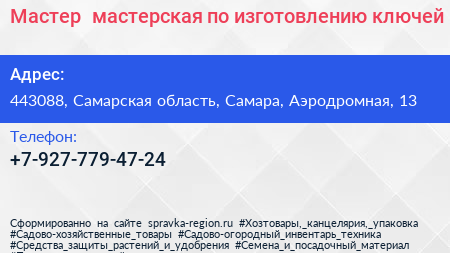 Мастер+, мастерская по изготовлению ключей по адресу 443088, Самарская область, Самара, Аэродромная, 13 в дальнейшем Организация, размещена в следующих категориях: