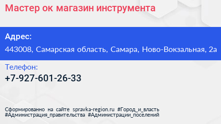 Мастер`ок, магазин инструмента по адресу 443008, Самарская область, Самара, Ново-Вокзальная, 2а в дальнейшем Организация, размещена в следующих категориях:
