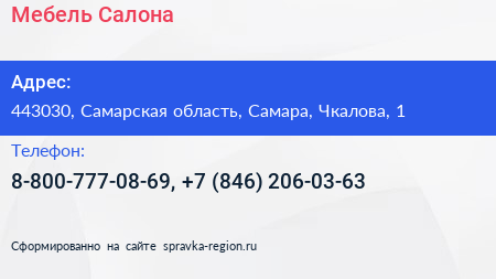Мебель Салона по адресу 443030, Самарская область, Самара, Чкалова, 1 в дальнейшем Организация, размещена в следующих категориях: