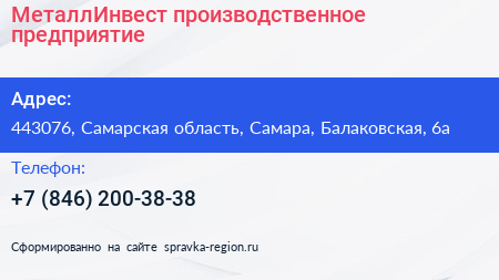 МеталлИнвест, производственное предприятие по адресу 443076, Самарская область, Самара, Балаковская, 6а в дальнейшем Организация, размещена в следующих категориях: