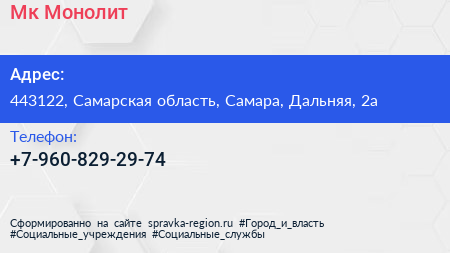 Мк Монолит по адресу 443122, Самарская область, Самара, Дальняя, 2а в дальнейшем Организация, размещена в следующих категориях: