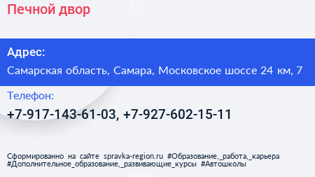 Печной двор по адресу Самарская область, Самара, Московское шоссе 24 км, 7 в дальнейшем Организация, размещена в следующих категориях: